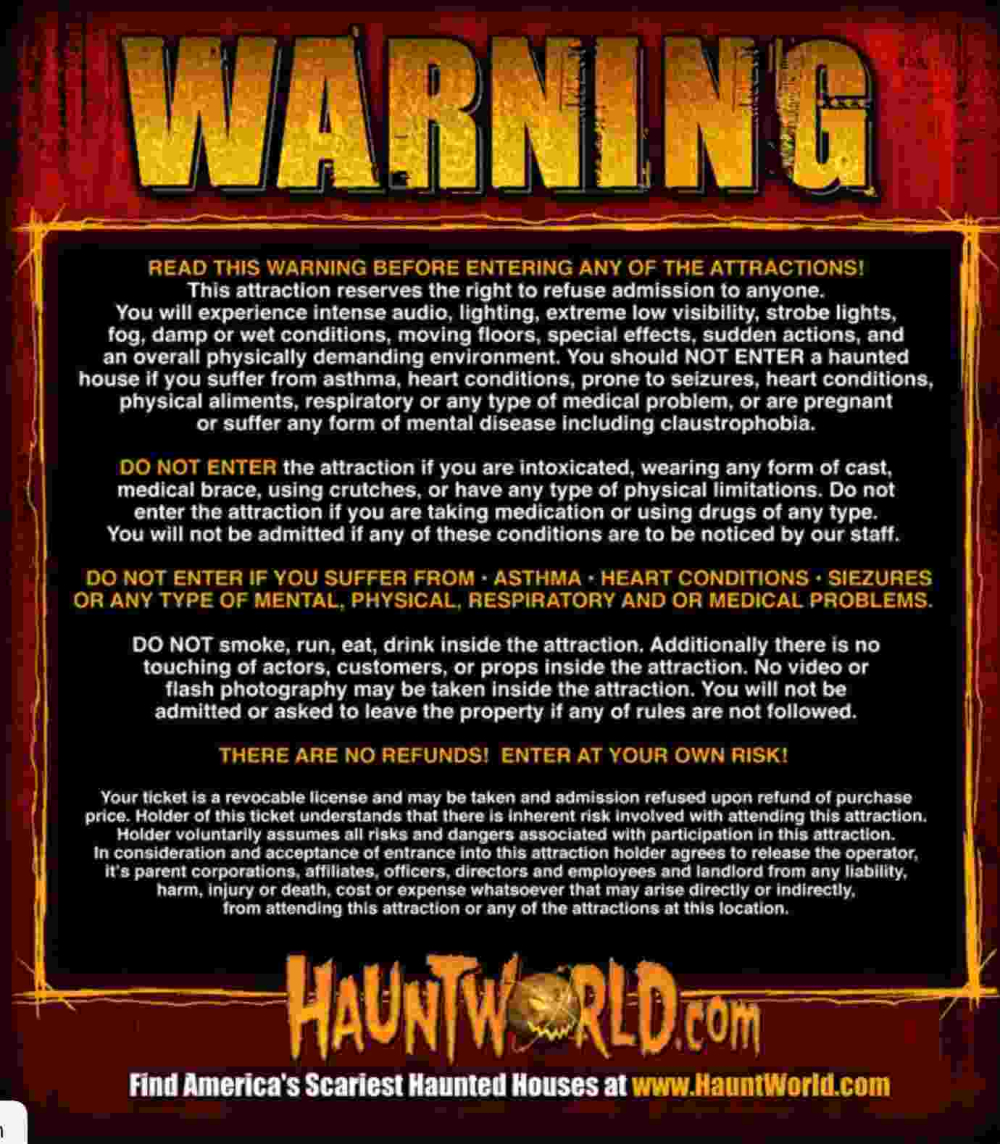 This attraction reserves the right to refuse admission anyone. You will experience intense audio, lighting, extreme low visibility, strobe lights, fog, damp or wet conditions, moving floors, special effects, sudden actions, and an overall physically demanding environment. You should NOT ENTER a haunted house if you suffer from asthma, heart conditions, prone to seizures, heard conditions, physical ailments, respiratory or any type of medical problem, or are pregnant or suffer any form of mental disease including claustrophobia.
